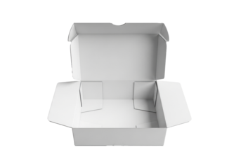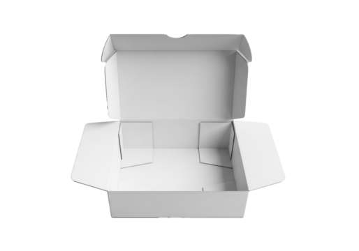 Empty, pristine, new, rectangular white cardboard packaging box, open with lid up, clean interior, sharp edges, on a seamless transparent background, professional studio photoshoot concept for graphic