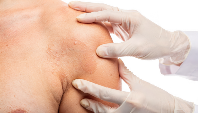 Handsonly shot of a doctor carefully inspecting axillary skin for signs of thickening and texture changes showcasing medical examination tools absent on white.