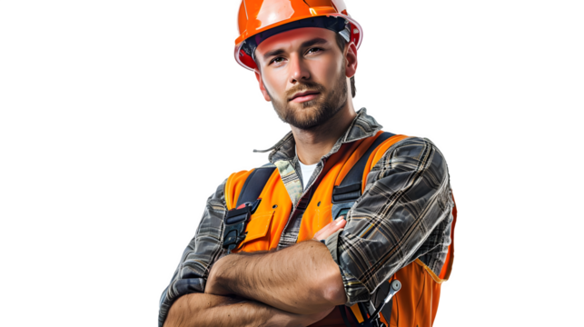 Bold construction worker isolated on a transparent background, PNG, Ai