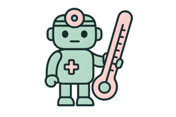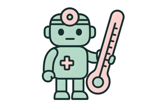 Green robot doctor holding thermometer cartoon, futuristic AI healthcare assistant for hospitals, medical monitoring, and digital health technology