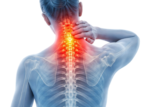 Human upper back and neck anatomy showing cervical spine inflammation pain affecting nerves muscles and vertebrae isolated on white background