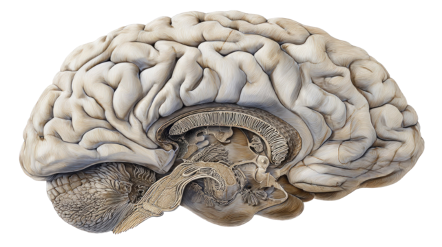 human brain anatomical cross section detailed neural structures medical illustration realistic texture isolated on white backgound