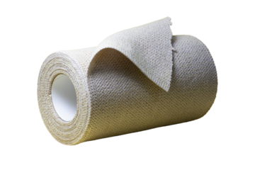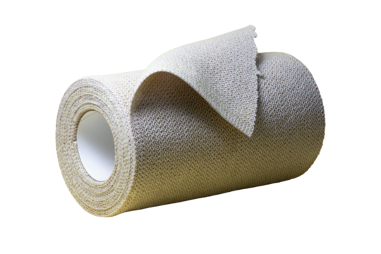 A rolled beige elastic bandage with textured fabric, partially unwrapped, isolated on transparent, representing medical support, injury care, first aid