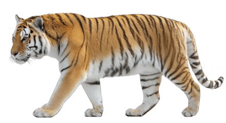 A tiger with distinct stripes is walking, showcasing its powerful physique and tawny coat in a natural setting.