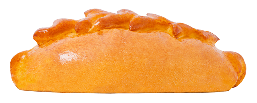 Pie closed with baked pigtail of dough, side view, isolated on transparent background .
