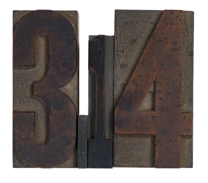 Isolated antique wood block type in reverse spelling 3.14 for pi day
