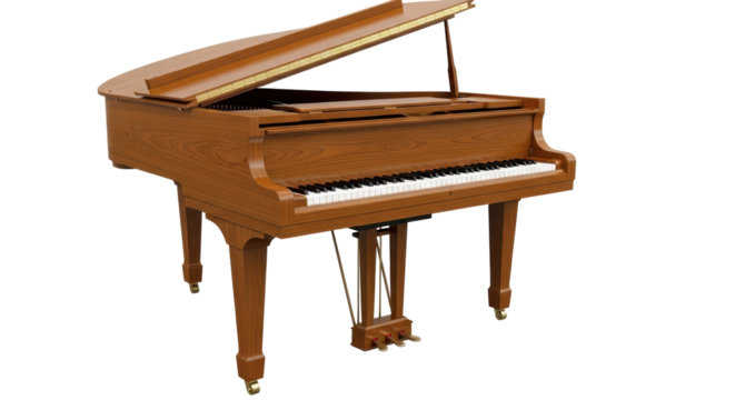 Classic wooden grand piano with an open lid front view isolated on a transparent background