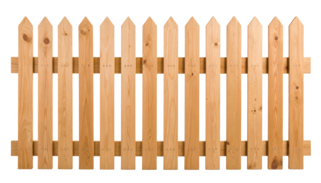A wooden picket fence panel with evenly spaced vertical slats featuring pointed tops and a natural wood finish.