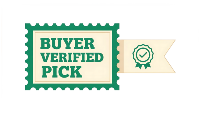 Green and beige buyer verified pick stamp with checkmark isolated on a transparent background