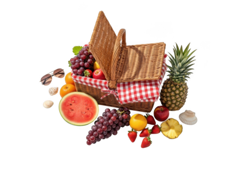 Abundant picnic basket filled with fresh fruits and vegetables isolated on transparent background