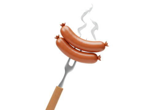 Isolated Two grilled sausages on a fork with steam, cooking concept, summer barbecue meal