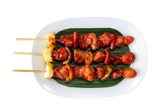 Grilled kebab on white plate isolated on transparent background
