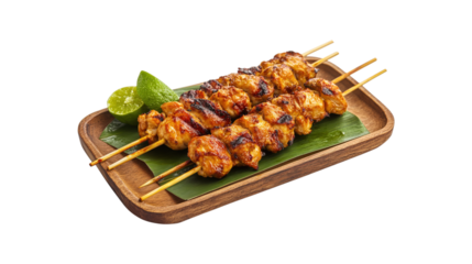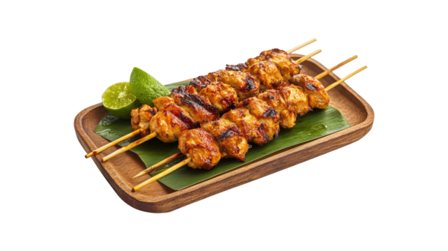Chicken skewers with lime on wooden plate isolated on a transparent background