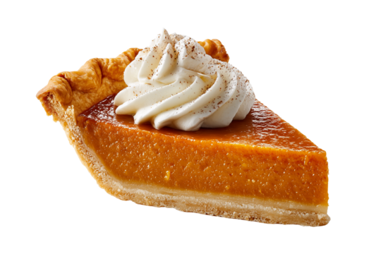 Slice of pumpkin pie with whipped cream and cinnamon topping isolated on a transparent background dessert