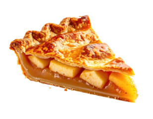 Apple pie slice → flaky wedge with caramelized apple layers on clean plate, front three-quarter → isolated on transparent white background, no shadow or reflection, tight crop, brandless, no t
