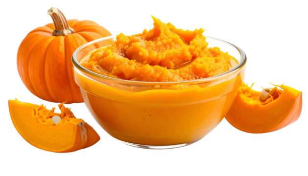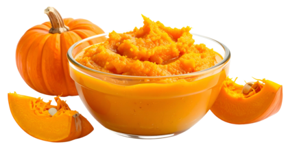A bowl of orange pumpkin puree with a whole pumpkin and cut wedges