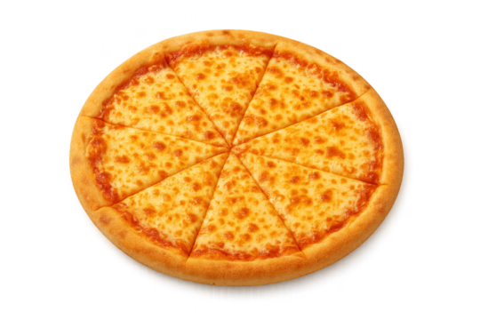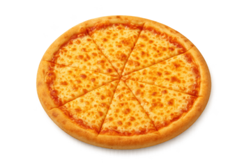 Whole cheese pizza with golden crust, sliced into eight triangular pieces on transparent background