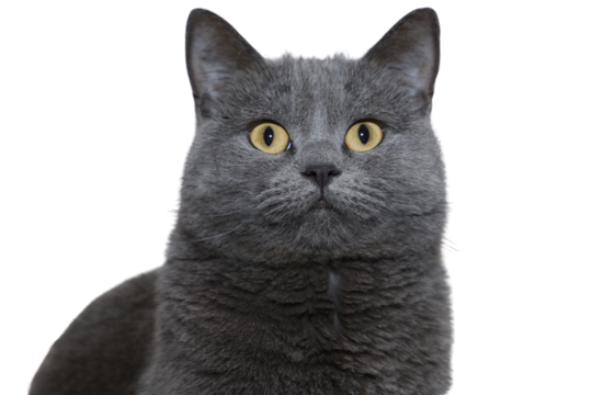 A close-up portrait of a beautiful British Shorthair cat with shiny fur and piercing yellow eyes on a transparent background. Stunning, detailed image perfect for any creative project.