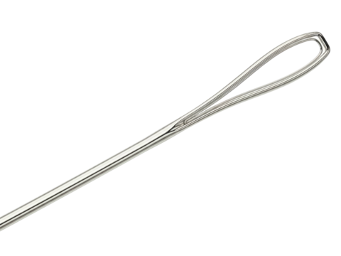Extreme macro shot of the eye of a silver sewing needle tool on a transparent background