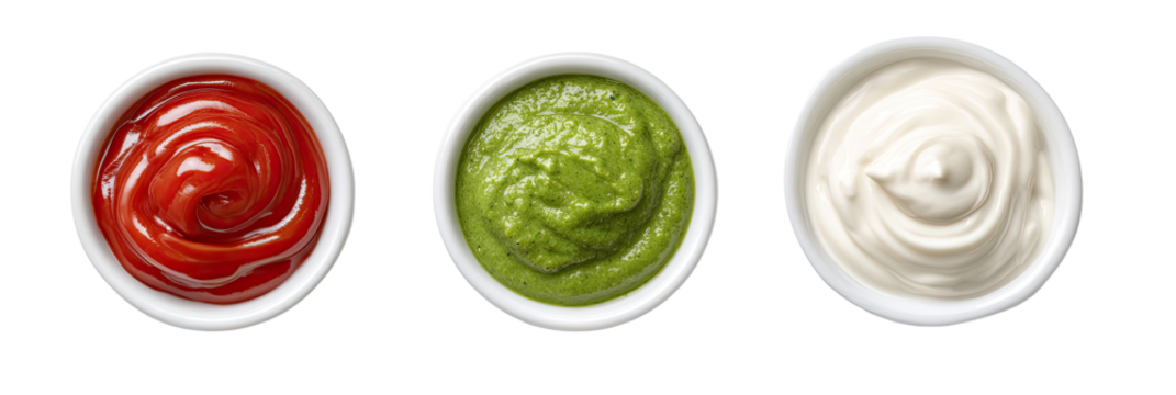 Three small white bowls filled with different sauces (1)