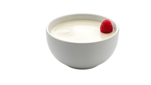 A small white bowl filled with creamy yogurt and a single raspberry