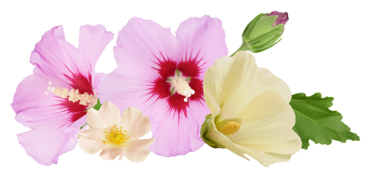 collage of pink and yellow hibiscus flowers and a small white rose isolated on a transparent background, ideal for spring and summer floral designs.