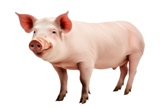 Side view of a pig with pink skin and a curly tail , isolated on transparent background cutout.