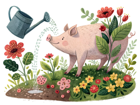 Charming pig enjoying a garden filled with flowers and a watering can, whimsical art,isolated on white background
