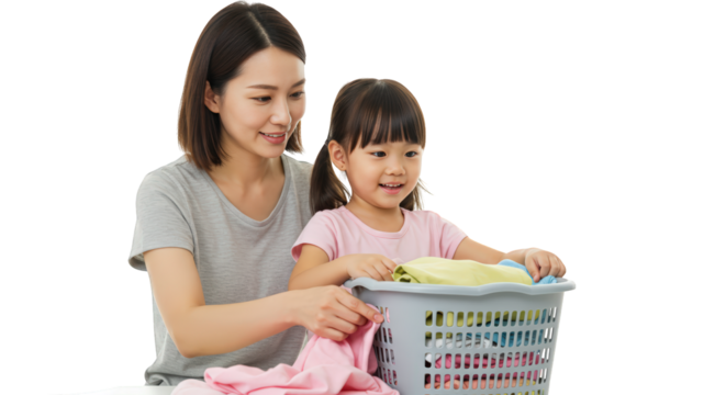 Young asian schoolgirl with pigtails wearing a uniform and backpack smiling happily isolated on transparent background