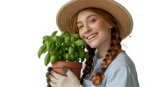 Smiling young woman with red braids and straw hat holding a potted basil plant isolated on transparent background