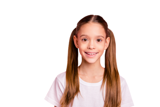 Close up photo beautiful amazing she her little lady pretty hairdress easy-going like studying school weekend vacation mood wear casual white t-shirt isolated pink rose bright background