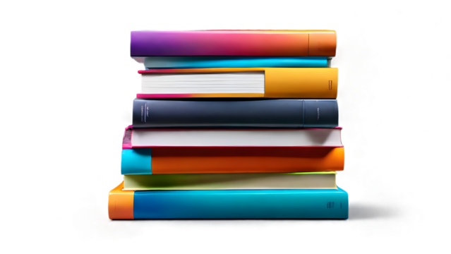 A front-facing 3D vector depiction of a stack of books with a red and blue color palette, set against a white backdrop.