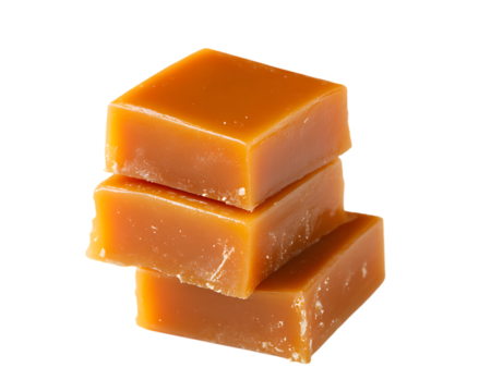 Three caramel candies stacked on top of each other isolated on transparent background.