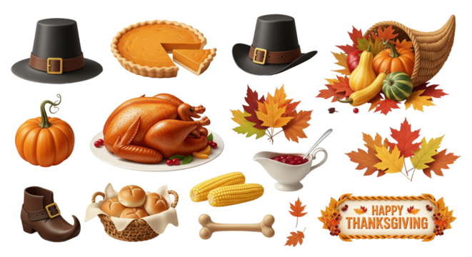 PNG Thanksgiving harvest feast essentials, element set on transparent background