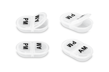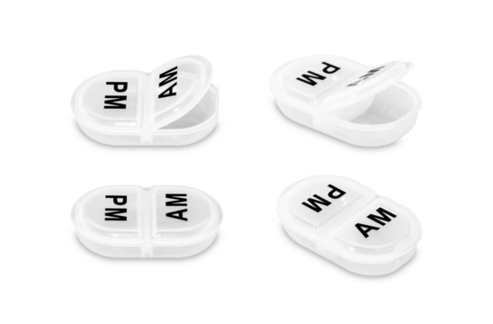 Empty daily pillbox for medications and nutritional supplements isolated on a white background.