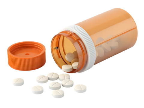 Prescription medication bottle with white pills spilled onto a surface, isolated on a black background.