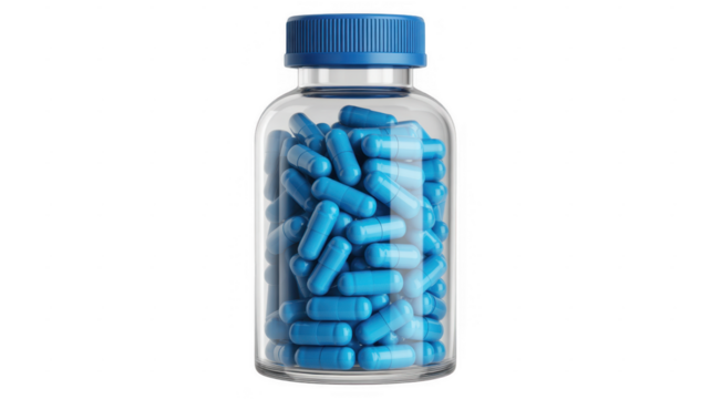 Blue capsules in a clear bottle medicine isolated on a transparent background