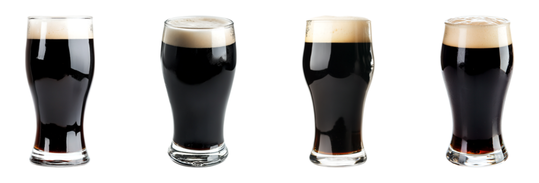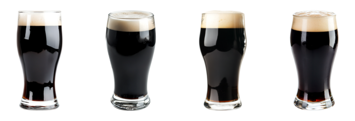 Set of pint of Guinness-style dark beer in a glass isolated on transparent background, in PNG format, cut out