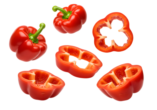red bell pepper, slices and halves on transparent background