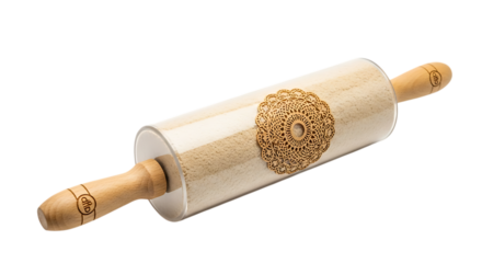 Wooden rolling pin with embossed pattern for baking and decorative pastry isolated on white and transparent background for kitchen concepts