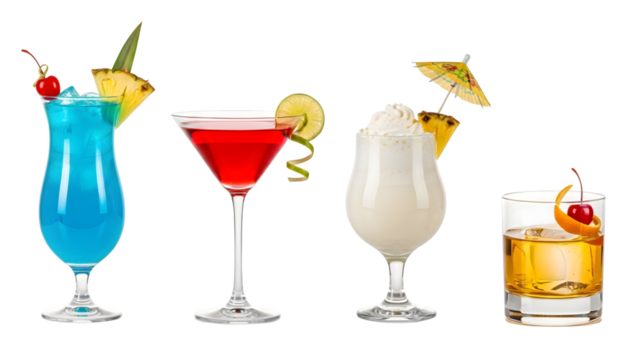 Four colorful frozen cocktails with fruit garnishes on a transparent background