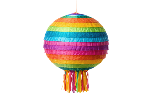 Vibrant spherical piñata with rainbow horizontal stripes and hanging ribbons, isolated on a transparent background