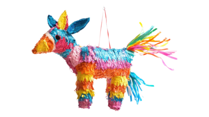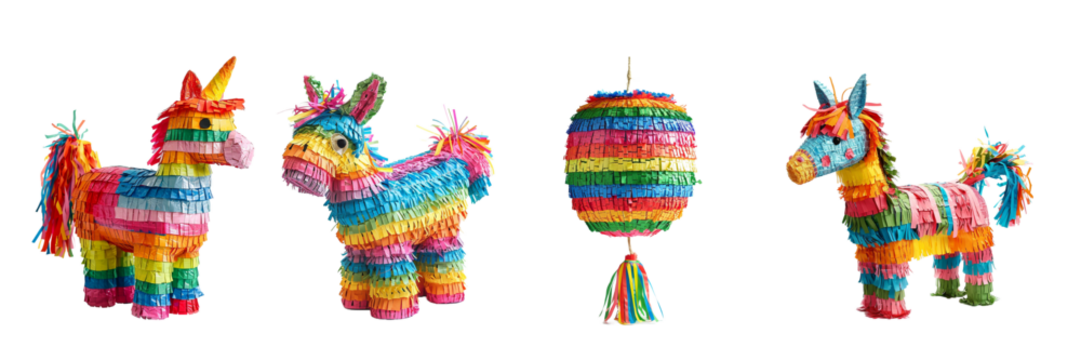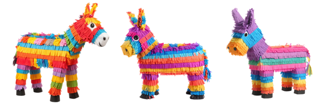Three Colorful Pinatas Featuring Unicorn And Donkey Forms Set Against A Transparent Background