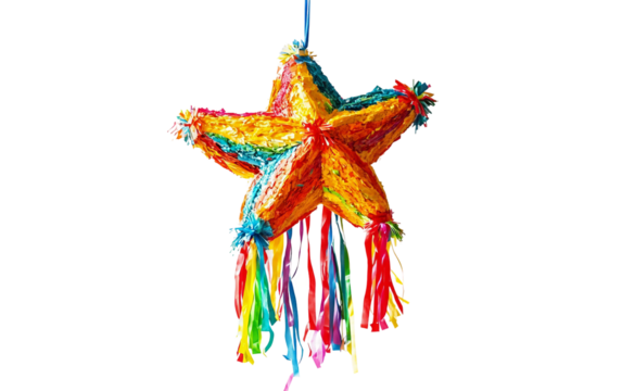 Traditional Mexican pinata in star shape decorated with bright colorful ribbons for festive celebration isolated on transparent background PNG