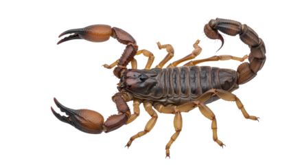 Isolated scorpion macro, arthropod with pincer claws, segmented body, and curved stinger tail