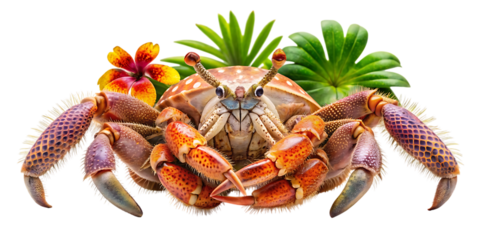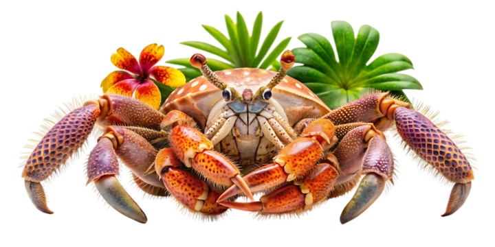 A large tropical crab with prominent claws and vibrant markings isolated against a black background