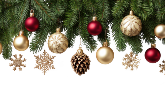 Festive christmas corner garlands with poinsettias bells and pinecones isolated on transparent background