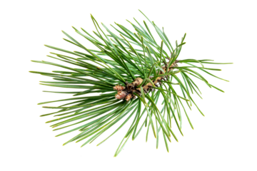 Close-up of a green pine branch with needles, isolated on a white background, perfect for holiday and winter-themed designs.