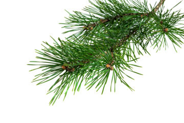 Realistic pine tree twig with vibrant green needles, for festive holiday decor or natural design elements, isolated on a transparent background.