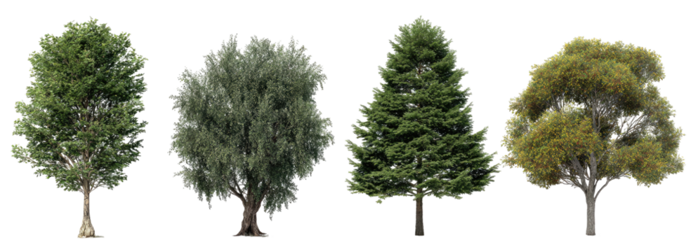 Diverse collection of architectural trees including pine, broadleaf, and palm, suitable for landscape plans and CAD drawings.